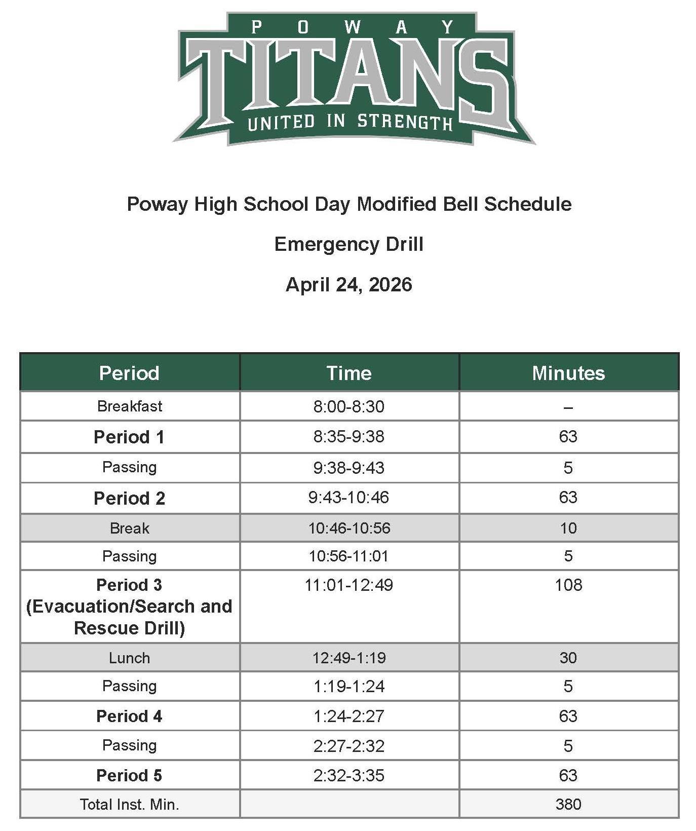 There will be a modified bell schedule on Friday, April 24, as we practice our emergency procedures. School start and dismissal times will remain the same (8:35 a.m. – 3:35 p.m.); however, class periods, break, and lunch times will be adjusted.