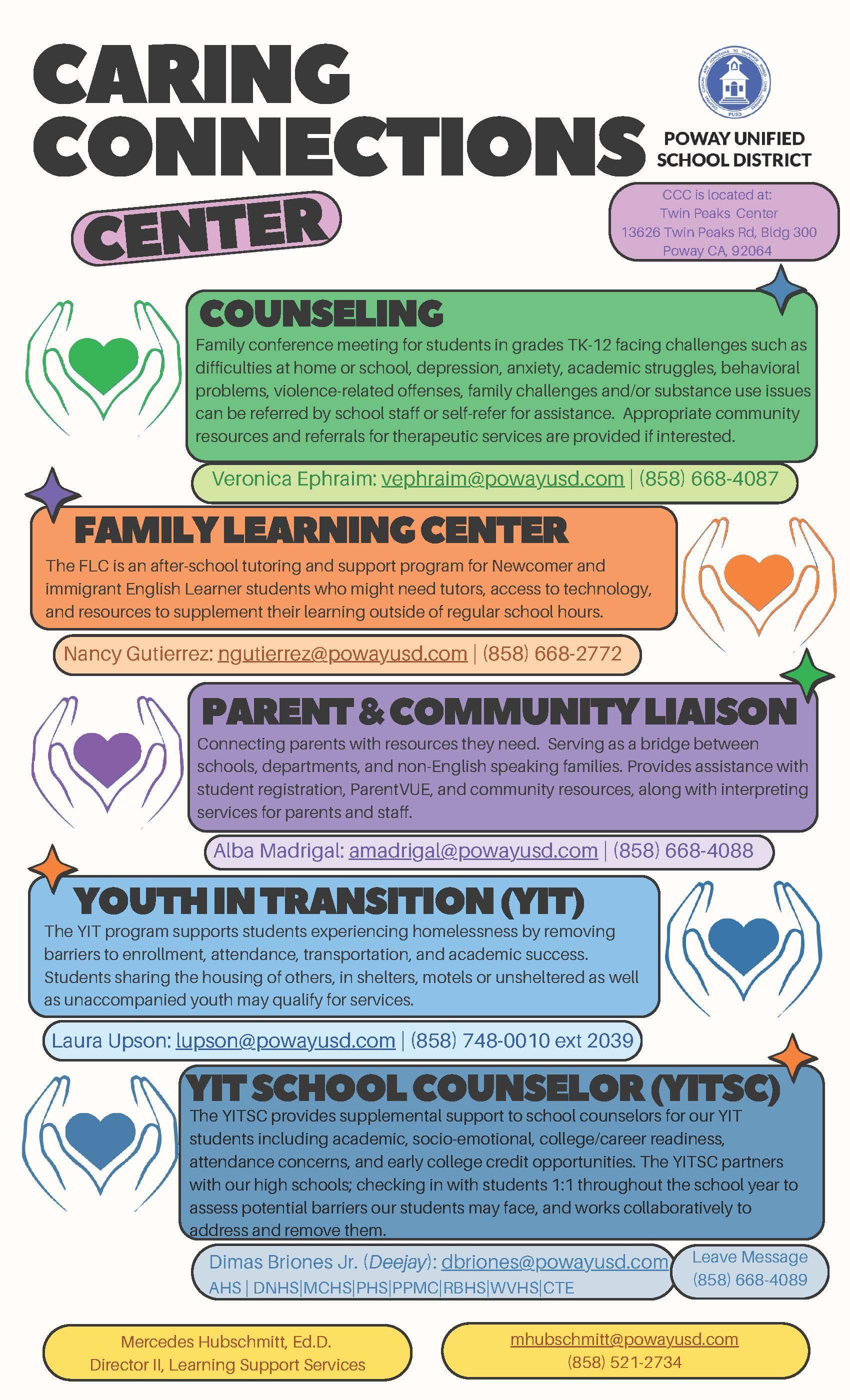 The focus of service is for students in grades TK-12 who may be experiencing any of the following: difficult situations at home or in school, depression, continued academic failure, involvement in violence-related offenses, alcohol or other drug-related behavior. Families may be referred by school personnel, or may choose to self-refer for assistance.
